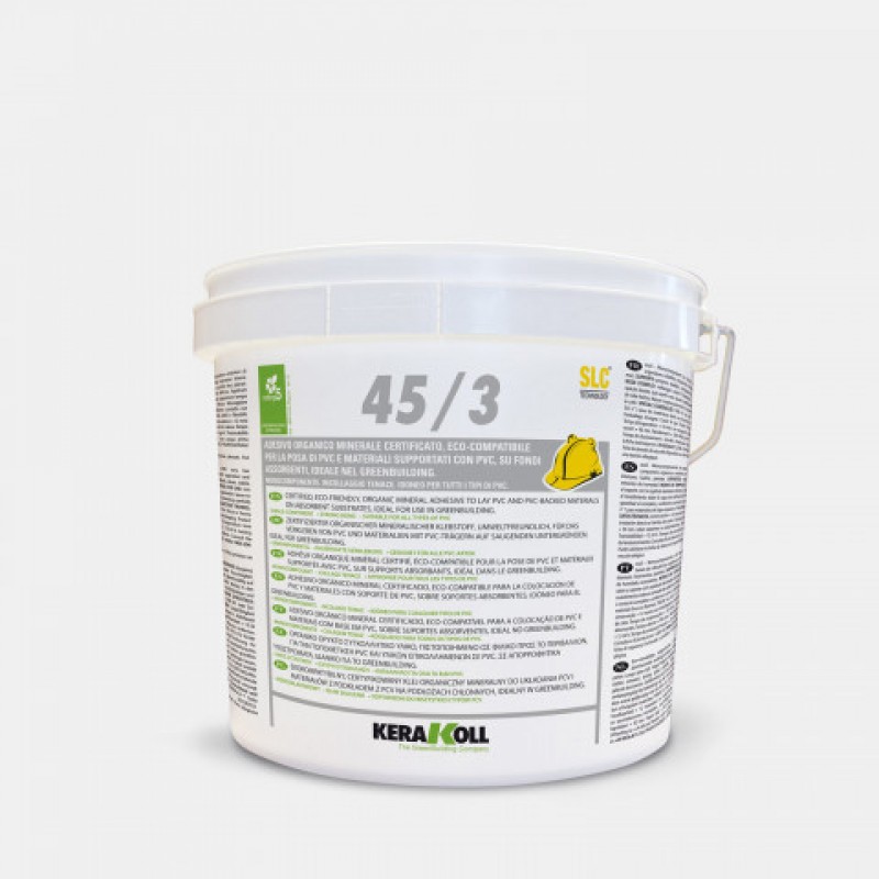 Το 45/3 παρέχει μία μεμβράνη ισχυρής συγκόλλησης για τη σίγουρη τοποθέτηση βινυλικών υλικών (PVC) όλων των ειδών, cushion, μοκέτας και γενικά υλικών με υπόστρωμα από PVC και για την τοποθέτηση καουτσούκ μέχρι 2 mm πάχος σε απορροφητικά υποστρώματα.
